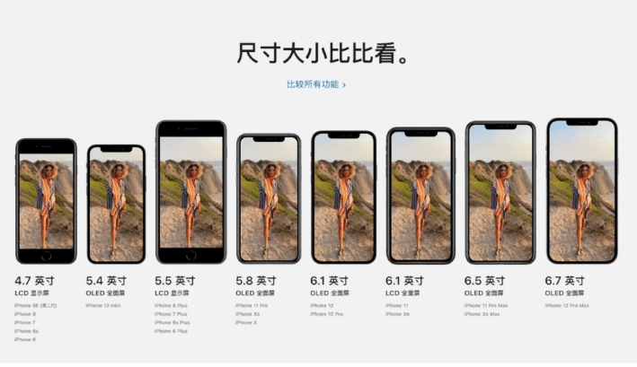 苹果官网展示了历代iPhone的屏幕尺寸,屏占比一眼看去很直观。