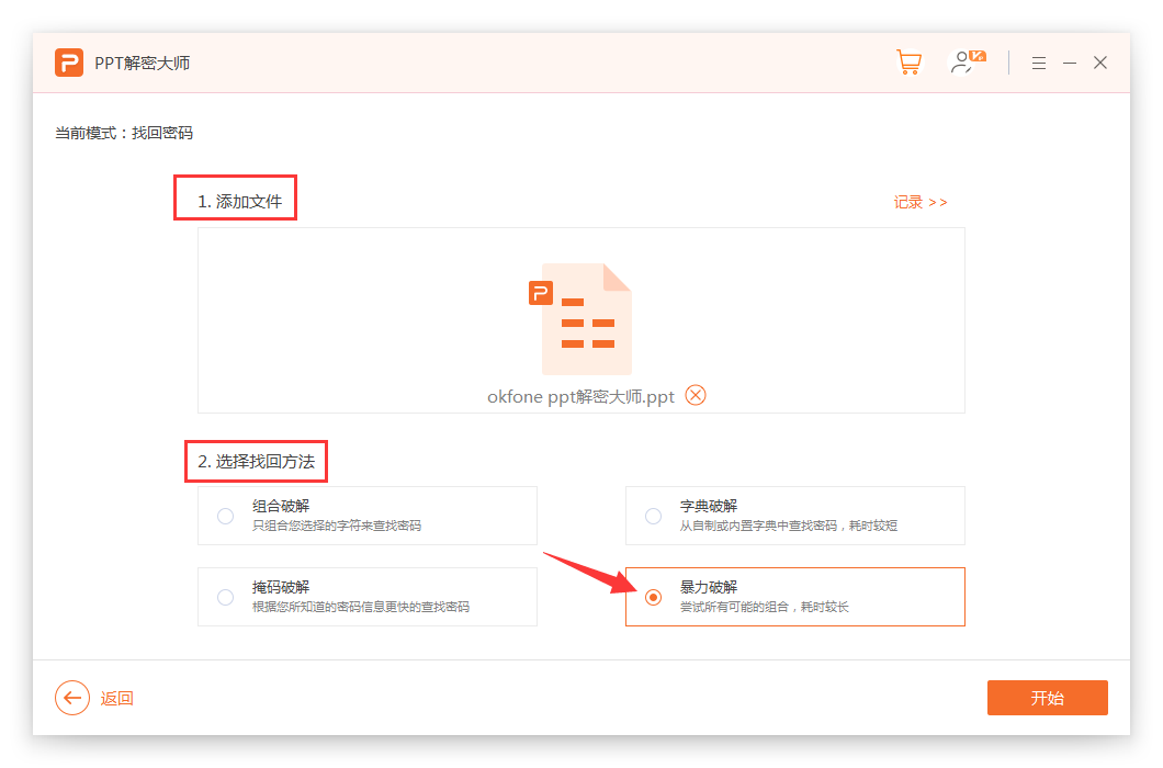 如果您不记得任何密码信息,请选择暴力破解。这个模式很暴力, 但很见效,处理时间也稍长。为了宝贵的资料,是值得付出的,请您耐心等待,后面的工作就交给PPT解密大师吧。