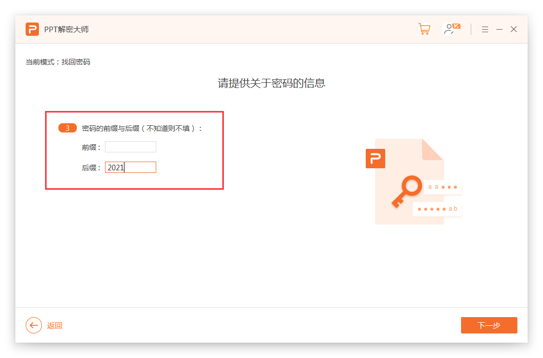 ②前缀与后缀:输入可能的密码前几位和后几位,点击【下一步】。